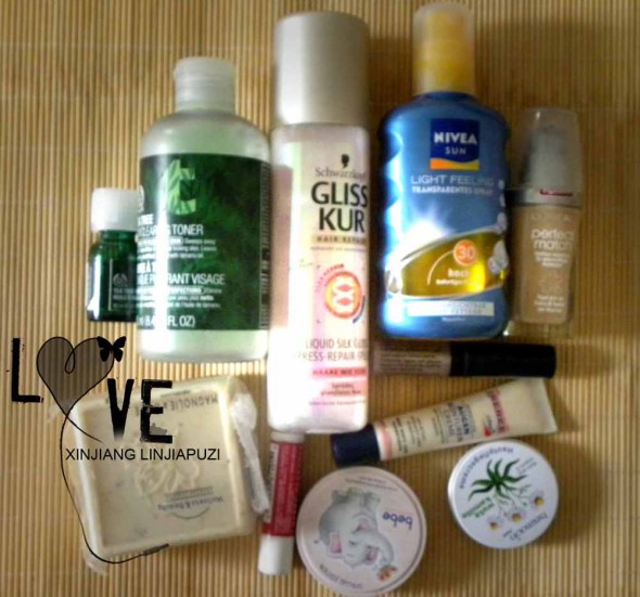 中间那个是德国产的施华蔻护法免洗喷雾,很好用,以前在国内就总买来着,在德国的时候一下买了3凭,因为一瓶才1.5欧,3瓶加起来还没国内一瓶贵呢!下面的洋甘菊护手霜买了10盒,全都送人了,自己留了一盒,旁边粉粉可爱的是婴儿霜很好用.洋甘菊上面的是非常好用的VE眼霜,保湿效果很赞,是在斯图加特的同学推荐的,超市自产品牌,才2.3欧,但是效果很好!!!眼霜上面的是DM超市买的一支唇彩,2欧,非常好用,关键是好看又便宜,买了5个回来送人.诶呀,只要您有心多逛逛,会发现非常多的本土品牌,非常好用而且便宜,和大牌不差上下哦!