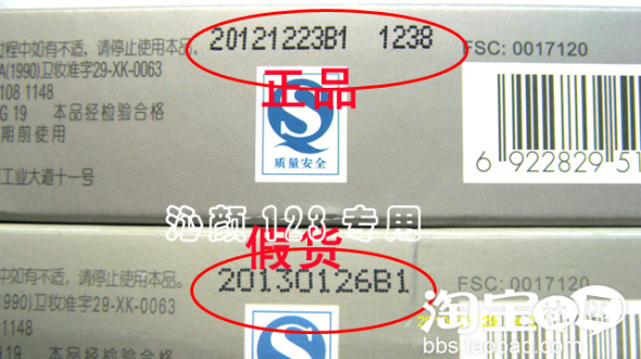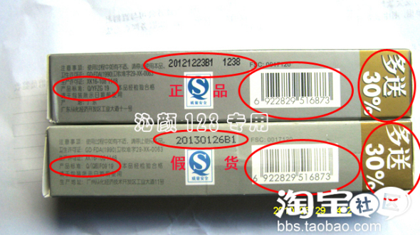 首先,正品的外盒的颜色比假货要更深一些。其次,大家看那个多送30%的字样,正品的字体是有深蓝色勾边的,而假货的字体是没有的。还有产品标准,正品的是Q/YFZG19,假货的是:Q/(QB)F0919 。