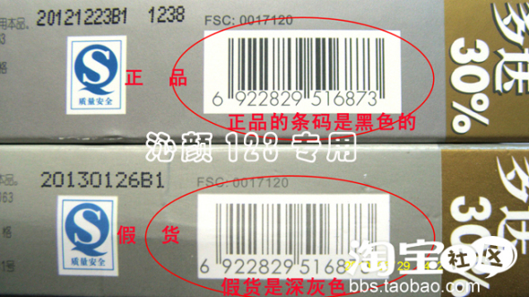 再来看条形码:正品的条形码的颜色是黑色的,而假货的是深灰色的 还有条形码的字,正品的更细一些,而假货的更粗