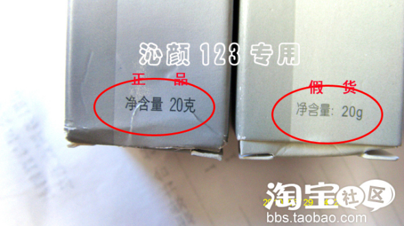 正品的净含量的是中文的:20克,假货的净含量的英文的:20g