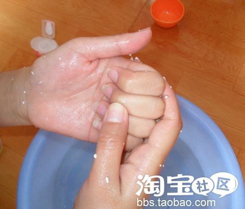 1.先用温水,把双手放入盆中,泡2~3分钟,这是为了软化皮肤,让毛孔扩张开,为后面的步骤打下坚实的基础。