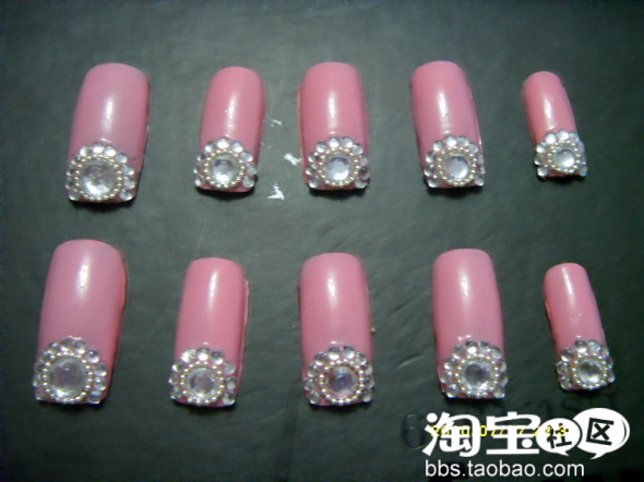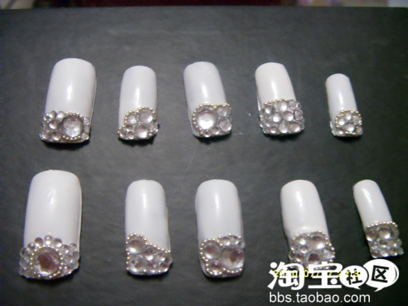 和左边的一样,一圈一圈的放钻上去。可以用牙签粘些透明甲油,粘钻。