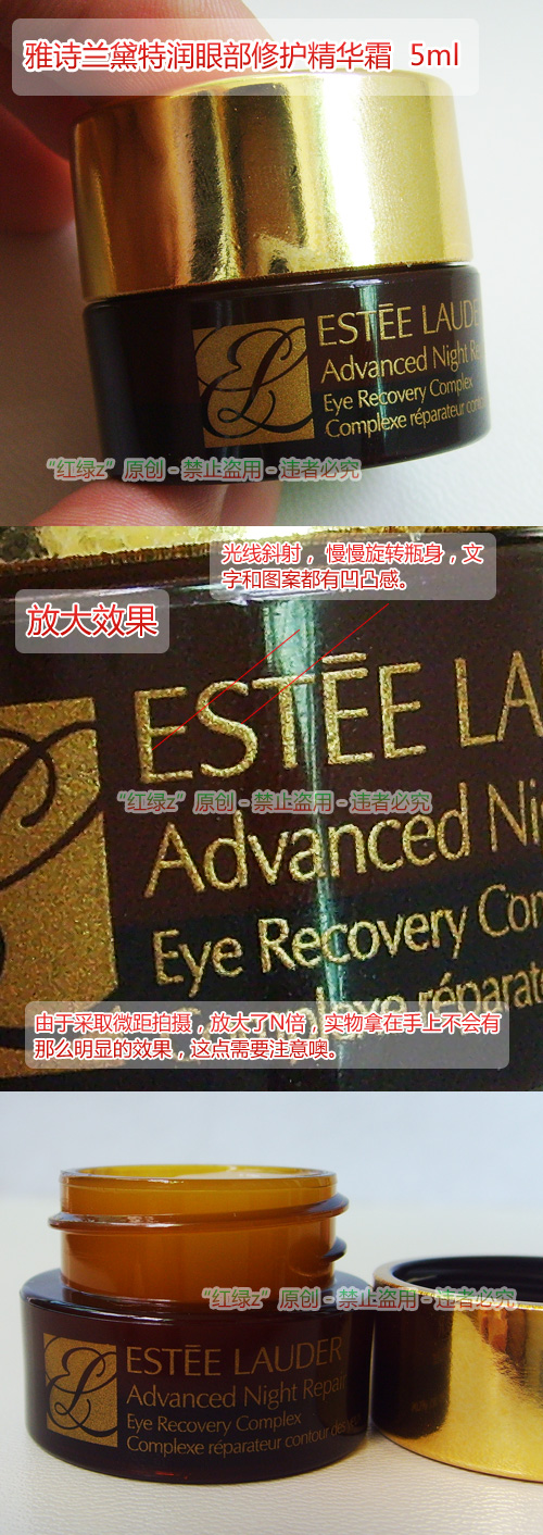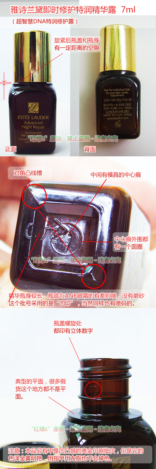 最后再补充一下:正品雅诗兰黛小样采用金色的印刷文字,颜色基本上都是采取暗金色的,只有在强光下和放大才显得明黄。采用金色瓶盖的小样,在自然光照射下,其色泽金黄饱满,拍摄后增加一下亮度和对比度,效果更加明显,这些特征都是假货难以达到的。