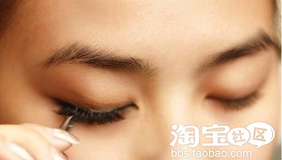 14. 待胶水半干状态时开始粘贴假睫毛。粘贴时要从眼头往眼尾的方向顺着睫毛的根部粘贴,同时眼头部位稍微留出一小段,这样就不会扎到眼角的肉肉,睁开时也比较的自然。(如实在无法一次性粘贴一整个假睫毛,也可将假睫毛修剪成3段,分段粘贴。此方法较适合新手)