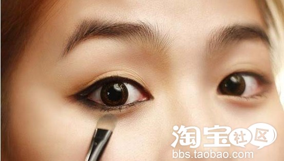7. 取适当的深色眼影粉勾画下眼睑。从眼尾慢慢的过度到眼头,笔触由粗到细。