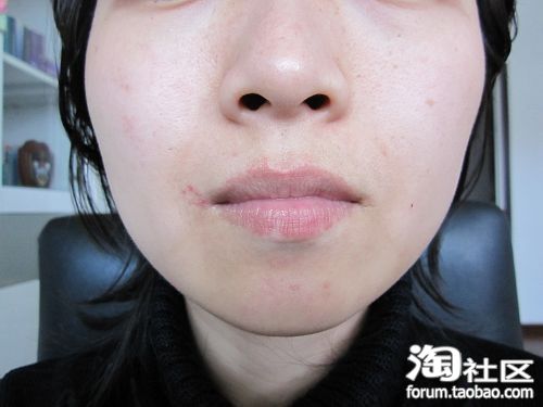 眉心中间的痘……已经多久了?!还很红~下巴上也有正在痊愈的痘,红啊~鼻头和脸颊……我不用说了,痘印一目了然啊~另外右嘴角因为我贪吃辣,长了一串火气泡~