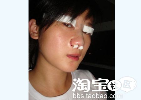 第二天去换药的照片,整个脸肿的跟猪头一样。隆鼻的时候大概一鼻子上面打了3针左右,一段一段打上去的!不是一针能搞定;再加上鼻翼的2针,一共是5针,哎~我数的非常清楚!