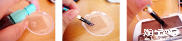 先挤一点水,然后用眼影扫沾点水。用湿湿的眼影扫沾深色这边的粉,要两面都沾满粉粉。