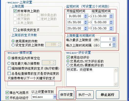 这样的话岂不是很麻烦,每几十分钟都要上架宝贝干脆什么也别干了哈。所以这个时候有一个非常好用的店铺管理工具就出场啦:自动上架/自动推荐软件没错哦,有了它你就可以提前设置在黄金时间段上架的宝贝了,比如现在我就可以在监视时间设定宝贝上架时间为的每天上午9点以后上架,点击“保存设置”。