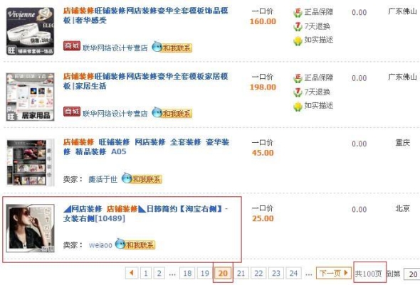 比如搜索“店铺装修”,排下来很多商品,后面的结束时间默认情况下是按由少到多排列的,排在前面的是还剩1分钟的。因为“店铺装修”这个词范围较大,所以20页以后才基本排到剩余2小时17分钟的商品