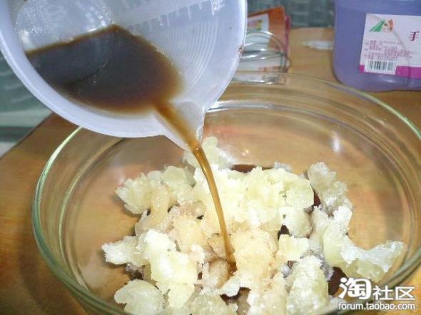 把粉与渣过滤掉。皂种撕成小块小块,容易溶解。杯子里的就是过滤好的粉水,慢慢倒入撕好的皂种里面。