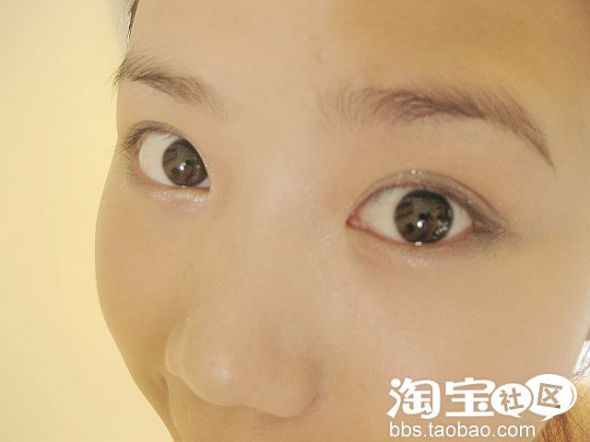 再用浅蓝银色涂双眼皮范围和下眼睑。(睁眼效果)