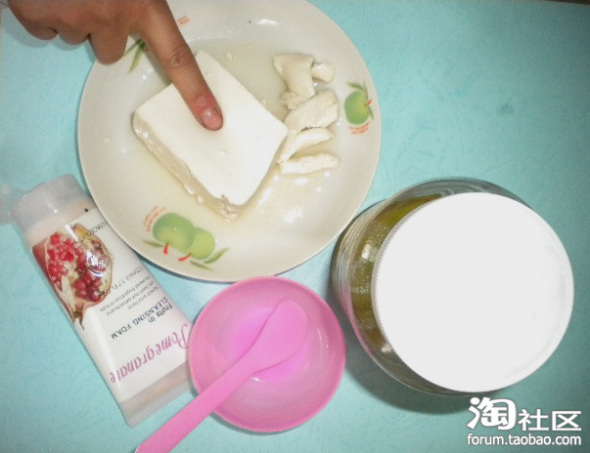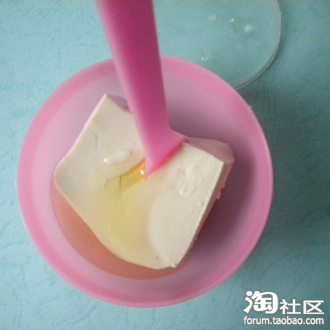 3、拌面膜,一定要将豆腐拌碎,因为太大块在脸上容易掉下来,水份也可以更好的流出