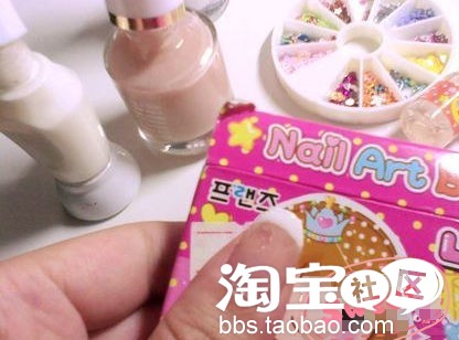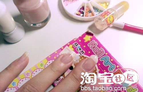描白边 5。开始法式美甲白边 法式美甲的精华就在于白边的描绘,这点很重要。 现在,我们开始描绘白边,用细小的刷头仔细的刷过手指甲的前端,要保证白边的平整光滑,不要参差不齐。 为法式指甲来些点缀 完成之后。