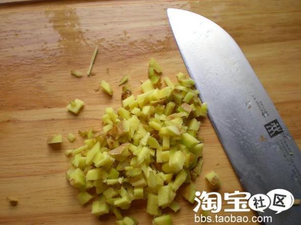 1。先用菜市场买的老姜洗干净,不用去皮,然后用专用的小砧板切成效丁,切记,不要用切菜的砧板哦,上面你想就知道多少油跟其他东西啦,反正弄到头发上肯定没好处,所以必须用专门的小砧板切姜,还有刀,也必须是干净的,不要沾到油