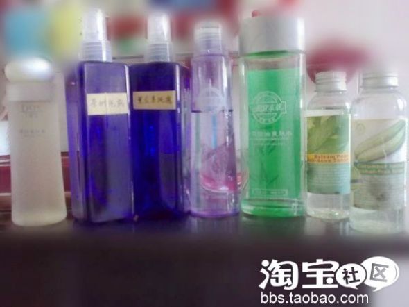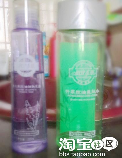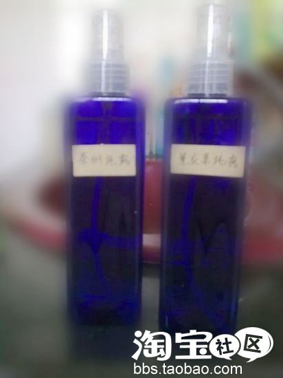 蓝色瓶子的两个水是从妙妙家买的。分别是薰衣草纯露和茶树纯露。薰衣草具有去疤、保湿、收缩毛孔、控油等效果,好处多多吖,茶树的专门治痘痘的,很多亲还不知道纯露,纯露是精油在蒸馏萃取过程中留下来的水,是精油的一种副产品,是在提炼精油过程中分离出来的一种100%饱和的东西,成份天然纯净,香味清淡怡人。它们比花水和市面上的爽肤水好的多哦,用起来很舒服。两瓶没有商标。说是进口的。我相信妙妙。