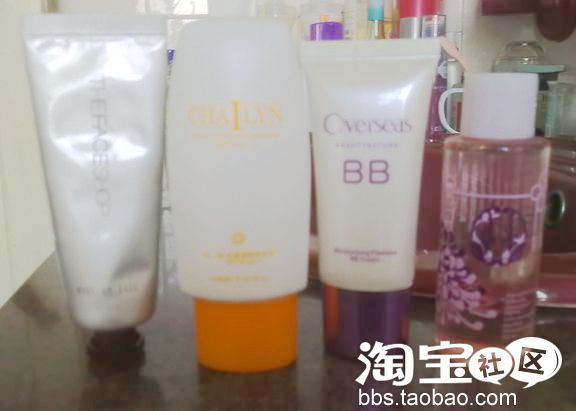 左边第一个是the face shop隔离霜18元,感觉一般吧。橘色的那个是防晒霜25。秒杀的时候买的。BB霜是欧夫诗的28。也是秒杀买来的。抹上去真的会出水。感觉很不错。粉色的那个是卸妆油。植物秀的26。卸的很干净。我本来买的是DHC的。但是卖家发错了。- -
