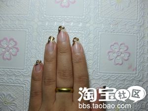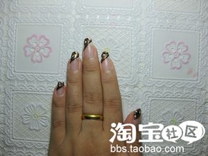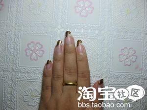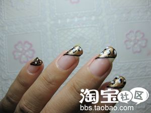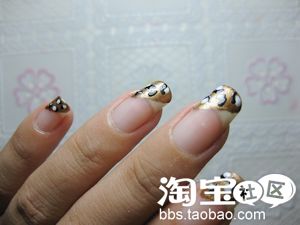 白色指甲油,在刚刚画好的深金色上面随意的点点,但是要注意,要等金色指甲油稍微干些