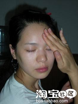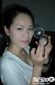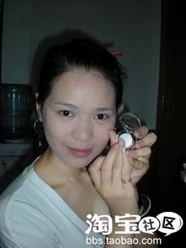 然后定妆咯 用粉扑沾取少量散粉 往脸上轻拍 (一定要少量多次哦)用无名指沾白色眼影打底 涂在整个上眼睑 然后用基本色 基本色就是自己想要涂的颜色啦 敏敏比较喜欢棕色滴 还是无名指沾取
