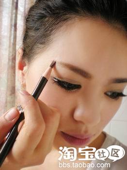 然后到眉峰的位置往下 眉峰的位置在黑眼球外侧上方 然后用眉笔将底线画干净