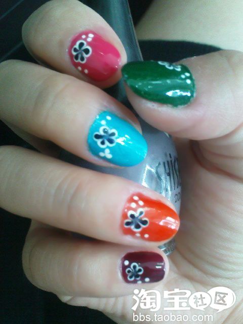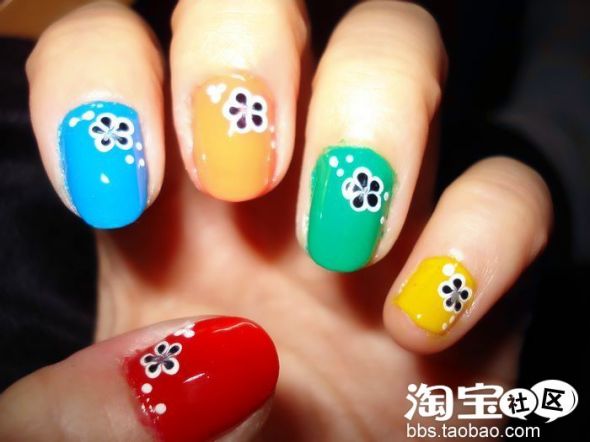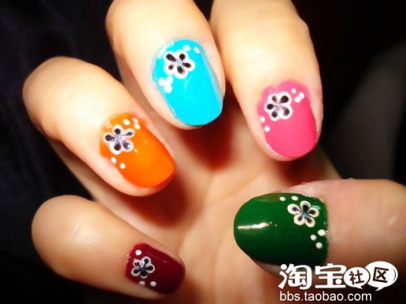 在每只手指上都点上这样的小花。再用小圆点点缀在花的周围,让整个图案更平衡也不单调。这样度假风的绚丽美甲就做好了。等干了之后再涂上一层亮油效果会更好。