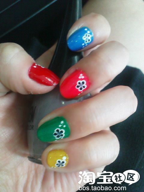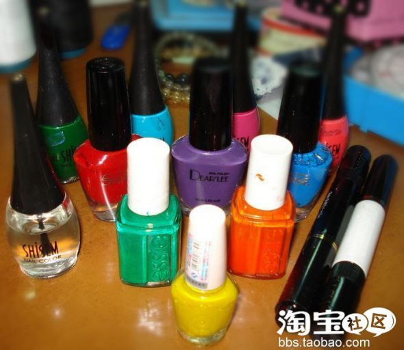 首先还是所需的指甲油和工具。10种颜色鲜艳的指甲油,有的MM没有这么多,5种也行,但是一定要颜色鲜艳,搭配才能出彩。再来就是底油(貌似没拍进来)和亮油,黑白两色点花笔。