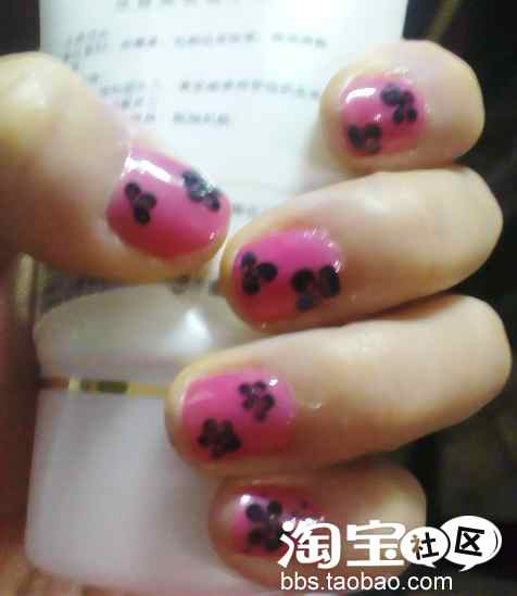 接下来就是点花了。掌握技巧之后其实很简单。点花要在未干的指甲油上进行,所以要在底色上先涂上一层透明亮油。主要是把握好亮油的湿度和点花笔里面挤出来的指甲油的分量。下面是分解动作: