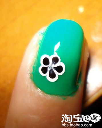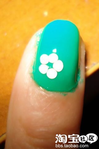 然后在亮油未干的时候用白色点花笔点上5个小圆点,大家要做几瓣花就点几个点