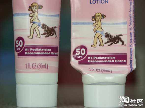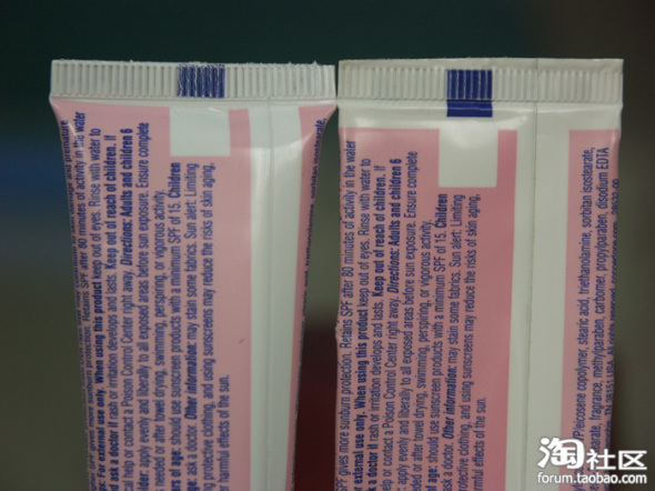这张有点虚,不过还是可以看出来标注防晒指数50的两个环形不一样,右边明显被拉长了,而且右边的环形外面还有一圈白色,左边根本没有。另外,右边那瓶中间蓝色条上“tear free”的左边那个水滴,我跟官网的照片也比较了,也是拉长的。