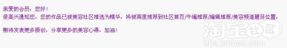 很高兴通知您,您的作品已被美容社区推选为精华,将被再度推荐到社区首页/牛编推荐/编辑推荐/美容频道醒目位置,