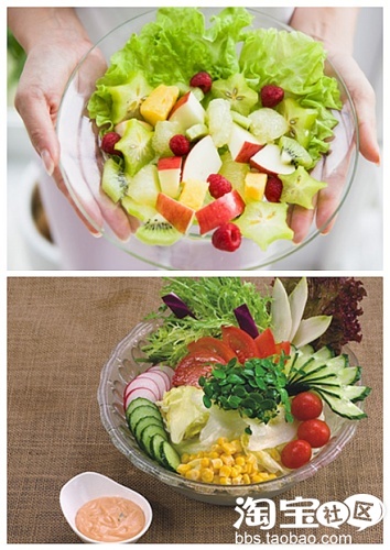 午餐时间(11:00----14:00)蔬菜沙拉或者是水果沙拉。这里的蔬菜沙拉指的是用沙拉油或者是醋的沙拉。千万不要用沙拉酱。沙拉酱能量是相当高的。会适得其反!如果是水果沙拉,可以搭配酸奶来食用。口感也会很好。