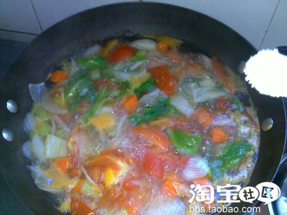2.水煮沸,先将洋葱、胡萝卜、西洋芹摆入炖煮,略软化后放入番茄,最后放入高丽菜。约半小时后熄火。洒上少许胡椒、盐,即可起锅。(亦可洒入些许意式香料调味)