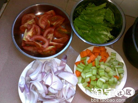 大番茄三颗 洋葱一颗 西洋芹一根 胡萝卜一条 高丽菜半颗 胡椒和盐各少许。