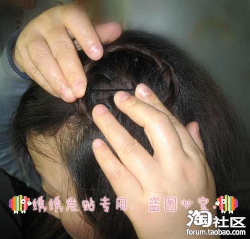 同样的,靠近头顶的地方先分出一部分头发来,把刘海也梳进去。