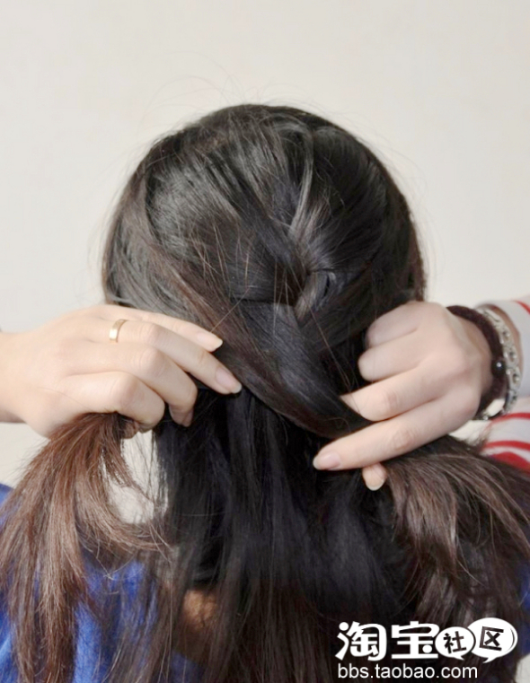 同样的。再从左侧也挑一股头发加入。然后继续编
