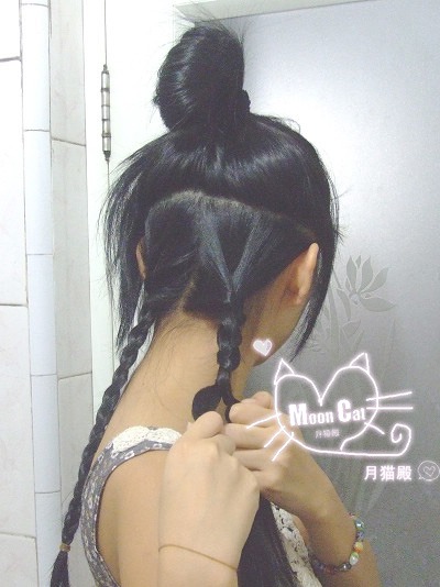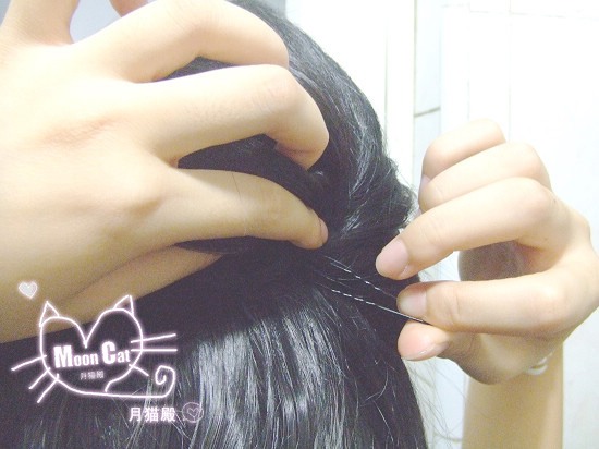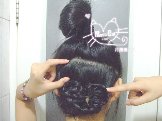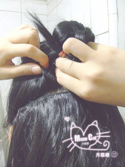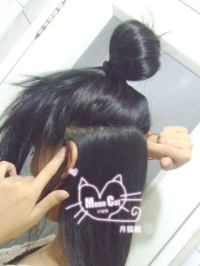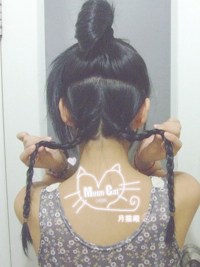 5.完成之后用黑夹子,地摊到处都可以买的这种,把那两根辫子盘上去,随便你怎么盘,但记住一定要越扁越好,盘好咯~~别一出去掉下来就好笑啦!