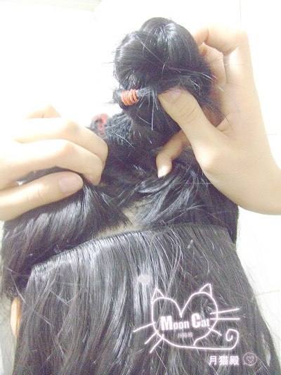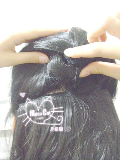 7.还没那么快完哦!上面的头发别忘了,直直的怎么看都穿帮。把上面的头发放下来重新梳好,然后把耳朵两边的头发拉松,垂下来一点:一是为了蓬松感,二是为了遮盖住假发那一条梗【虽然假发是超细梗,也不能让人看见咯!】