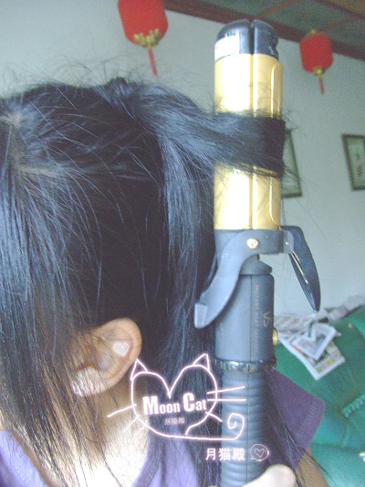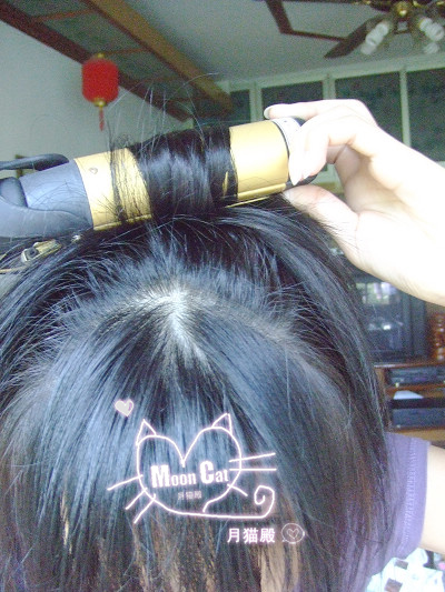 5.然后重要的开始了,用你的卷棒,我的是32MM的太粗~~大概25MM+的比较合适。看我手上抓的,靠中间那表面以圈头发,咱们得把它朝内卷,目的是为了蓬松合成一体。