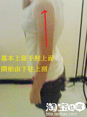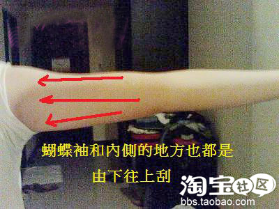 讨人厌的蝴蝶袖一直飘来飘去的啦,这个位置也都是由下往上刮,刮完后别忘了要记得按摩唷!