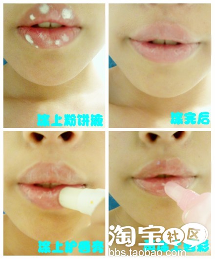 嘿嘿,1、用粉底液在唇部涂上。这样上唇彩会更好看一些(最近本人有点上火哈)