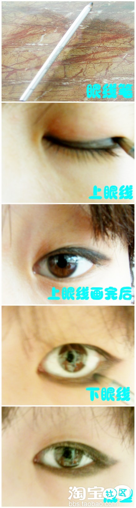 首先用眼线笔从上眼线眼涂到眼尾处,然后涂下眼线,最后在上下连接,详情如图。