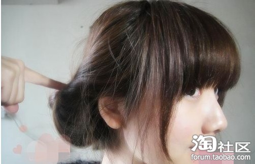 在我手指的这个地方,将头发中间分开,留出一个洞。