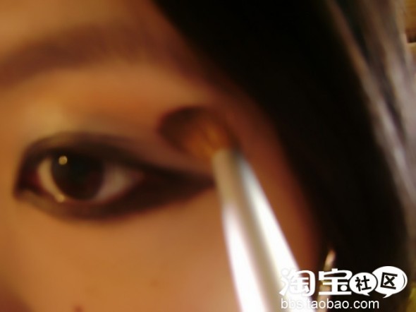 再用眼影刷沾取少量卡其色眼影涂于黑色眼影外围 尤其是眼皮中部