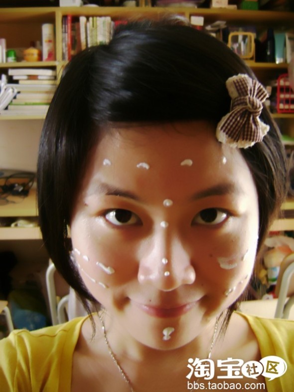 先清洁好脸 再用护肤品仔细涂好 先用化妆棉沾化妆水轻拍肌肤 再用眼霜 接着用乳液 保证肌肤水水的不干燥