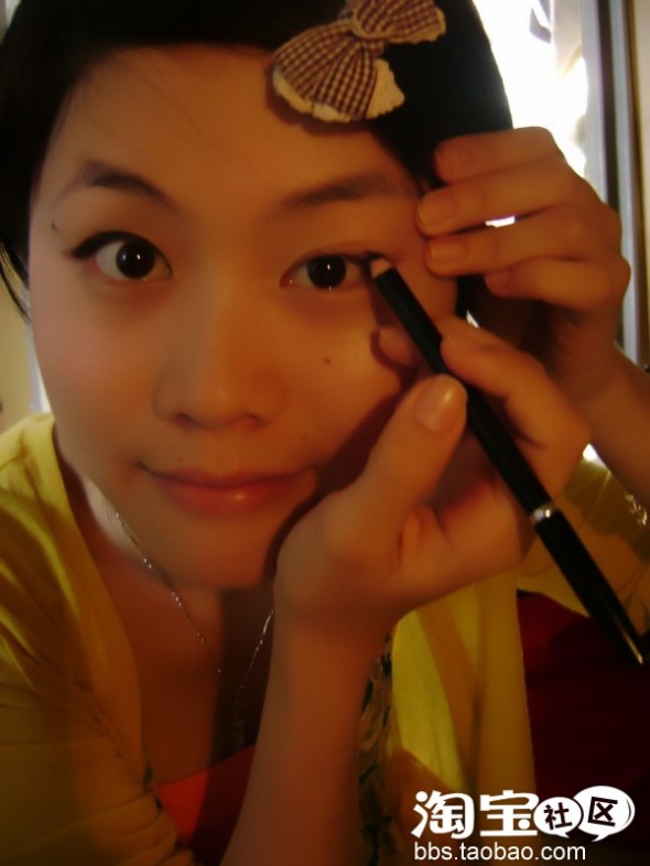 画好眼线 再用眼线刷沾取少量的黑色眼影粉 沿着双眼皮褶皱内周画 尽量画的有弧度美 这点需要不断地练习