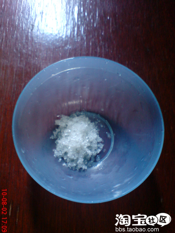 用一勺子的白糖,用一点点温水溶化它,注意温水的份量是糖的1/4,充分溶解