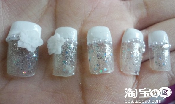 沿着白色甲油边缘贴着小珍珠