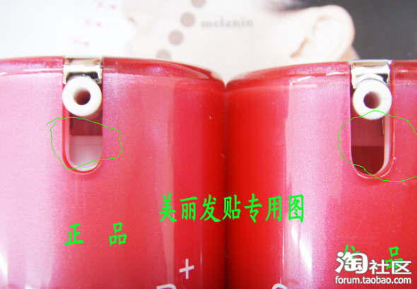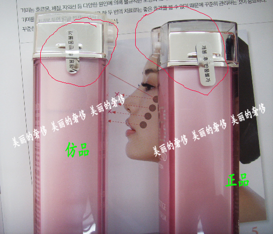 重要标志之二:因为正品是真空压的,所以里面的压泵是朝上的(嘿嘿,推理的,不对的话不要拿棉花砸额哦),仿的却不知道里面是什么东东了,这个也是重要的一个标志,MM们一定要记好了哦
