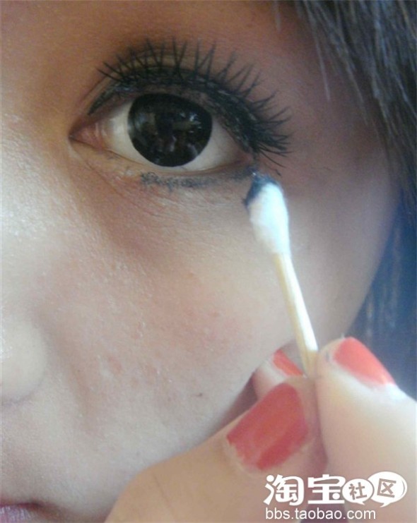 黑色可以叫眼睛变很大的,所以在眼镜上刷黑色的眼影。刷好了以后,如果觉得黑,或者不喜欢这么黑的