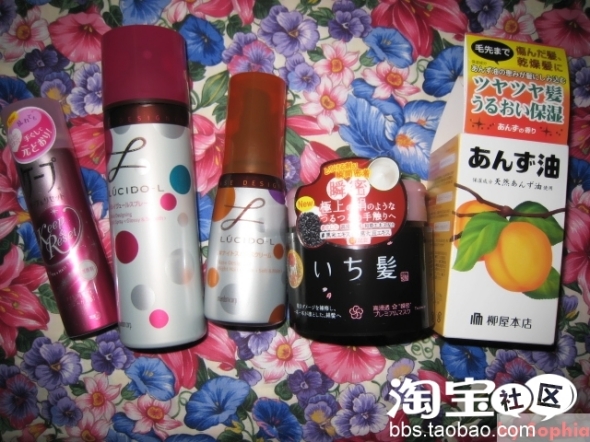 超级稀饭蒸发料。左起,Kao花王的便携整发喷雾,蓬松感的好物。LUCIDO-L的光亮喷雾,使头发恢复柔顺亮泽。还是LUCIDO-L的夜间修护液,夜间也要给头发做精华护理。@COSMO 2009年的大赏产品Kanebo精华发膜,最近又买了补充装,可以用一夏天,我用发膜如同吃。右边的是柳屋的杏桃核精华油,打理发梢,杜绝分叉。